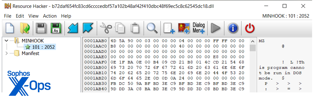 It also extracts the Minhook DLL from the resources (SHA256: bddd6adaee8ab13eabaa7c73c97718cee1437db2054ca713ec7cc86e8002a300). The DLL from this resource is the same as that available at https://github[.]com/howmp/pyminhook/raw/master/minhook/MinHook.x64.dll .