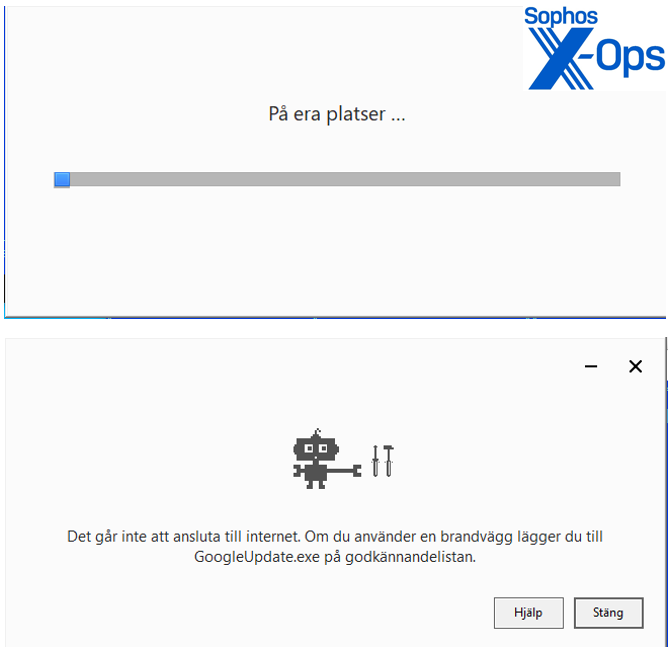 Figure 9: The installation attempting to be inconspicuous in Swedish. (The load screen above is fairly self-explanatory; the lower screen says “Unable to connect to the Internet. If you are using a firewall, add GoogleUpdate.exe to the approval list [whitelist]”)