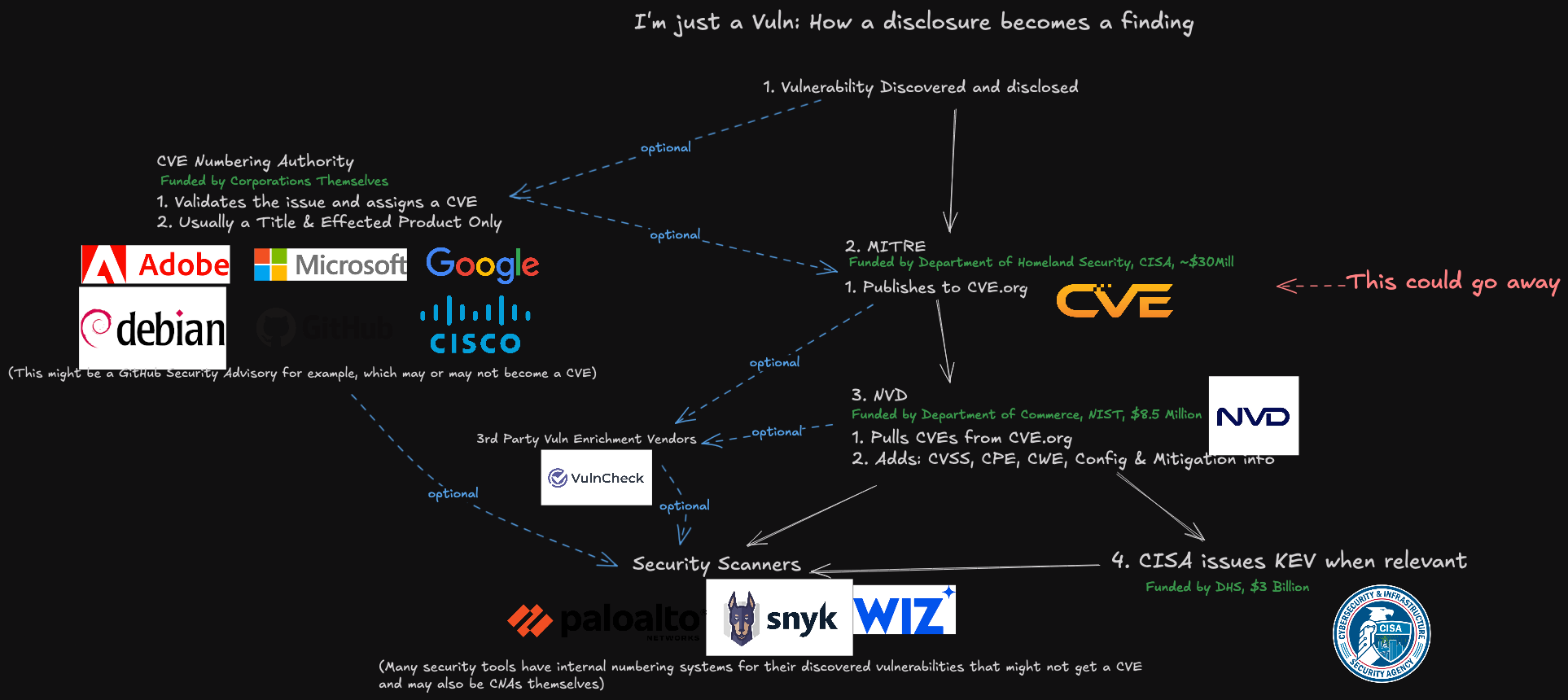 A representation of how a vulnerability becomes a CVE, and how that information is consumed. Image: James Berthoty, Latio Tech, via LinkedIn.