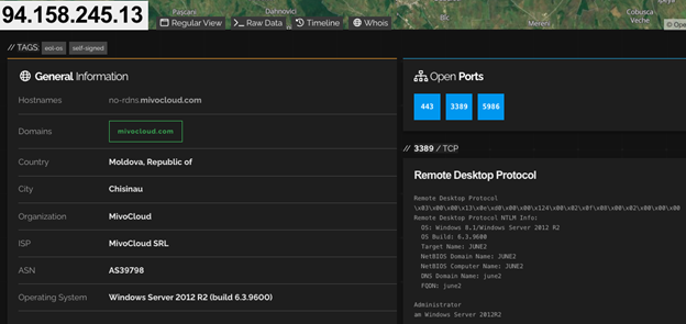 Figure 4: NetSupport RAT C2 server with exposed ports 443, 3389, and 5986 (Source: shodan.io)