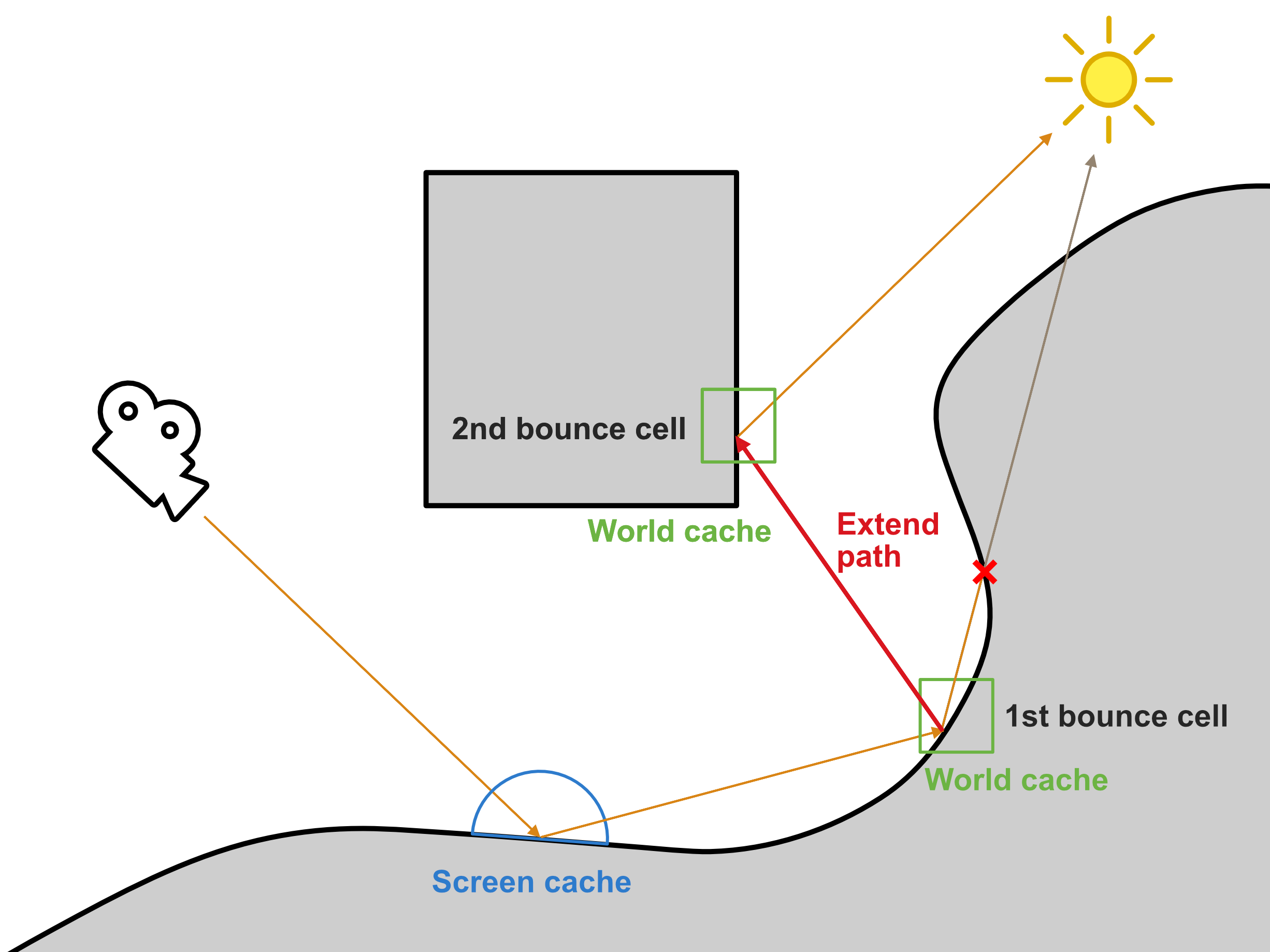 - Two separate Monte Carlo estimators are accumulated for each 1st bounce cell in order to keep track of the samples of direct and indirect light, respectively: