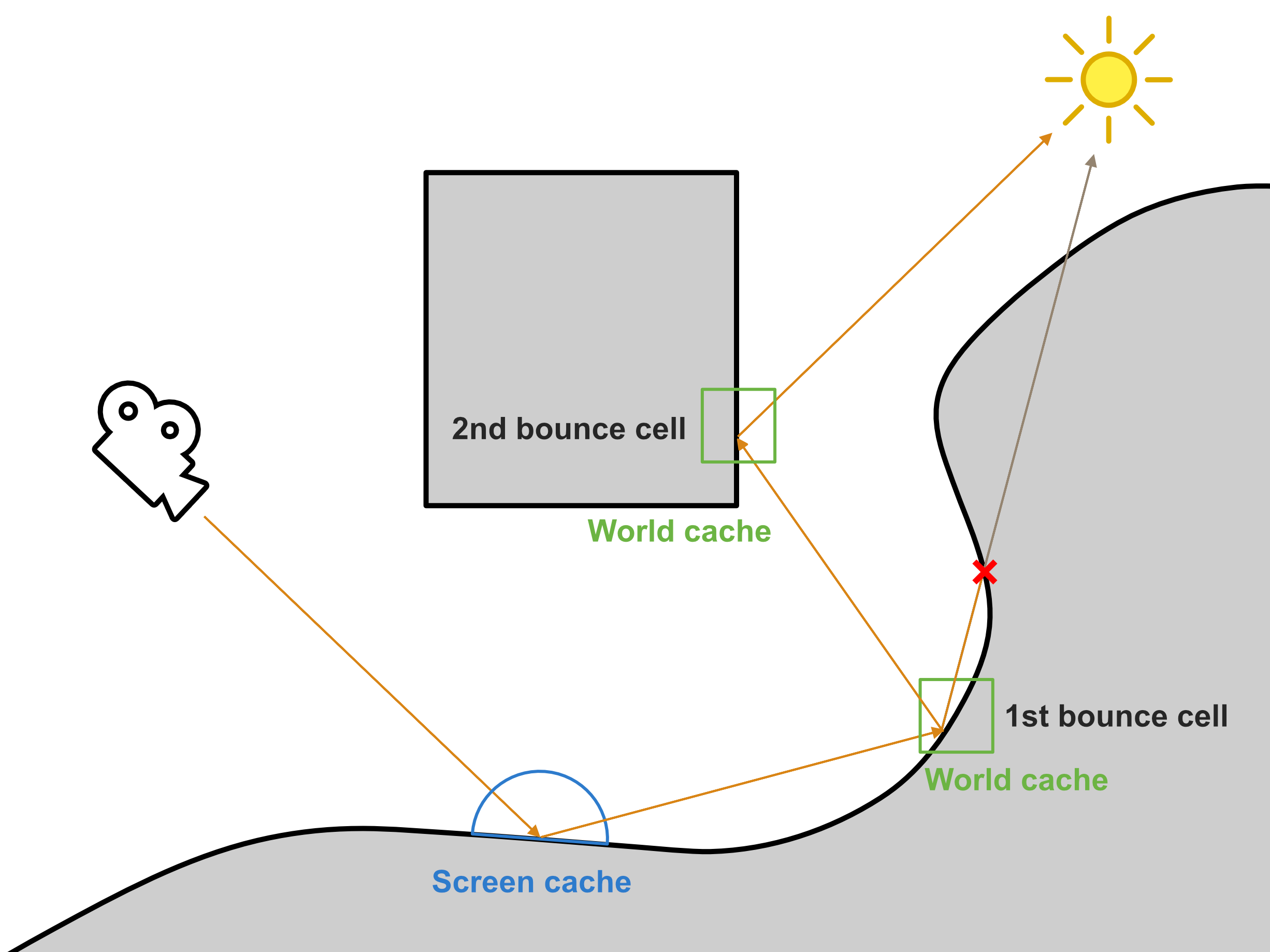 - Direct lighting is solved for 1st bounce and 2nd bounce cells.
