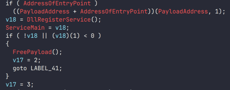 DllRegisterService. After loading, its entry point is called (to initialize internal structures), followed by this function. It provides an interface with the following possible commands: