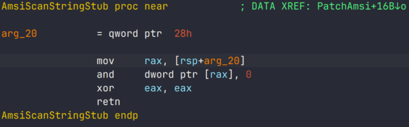 AmsiScanString function, a stub function is placed in memory that always returns 0 (thus marking the file as safe).