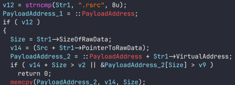 The payload is an executable file for 64-bit Windows systems. The command handler parses this file and extracts another executable file from its resource section. This extracted file then undergoes all loading procedures – obtaining the addresses of imported functions, relocation, and so on. In this case, to obtain the system method addresses, simple name comparison is used instead of hashing.