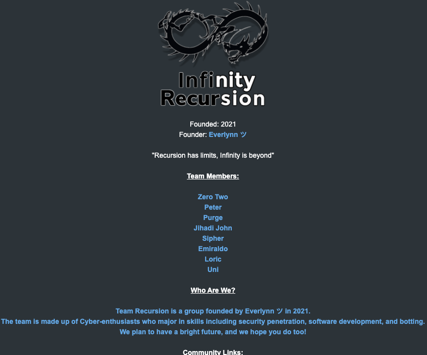 The roster of the now-defunct “Infinity Recursion” hacking team, from which some member of LAPSUS$ hail.